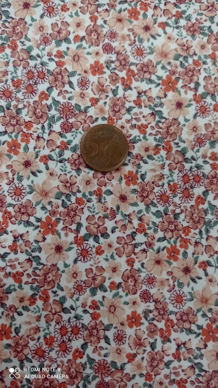Viyela de algodón 100% con estampado floral en tonos tejas. Ancho tela 1.50 mts.